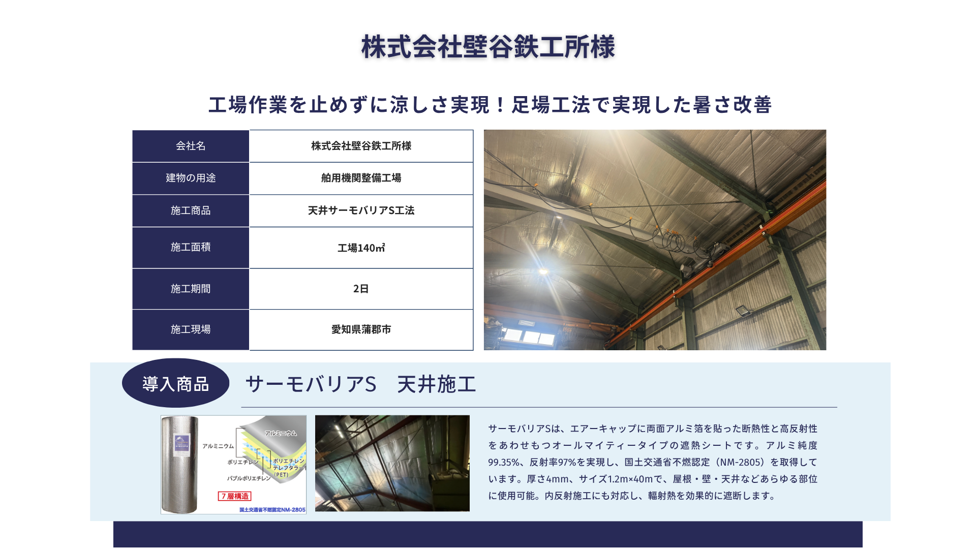 工場の屋根や壁に使用することで、太陽から発生する熱だけでなく、工場内の機械から発生する「輻射熱」も防ぐことができます。