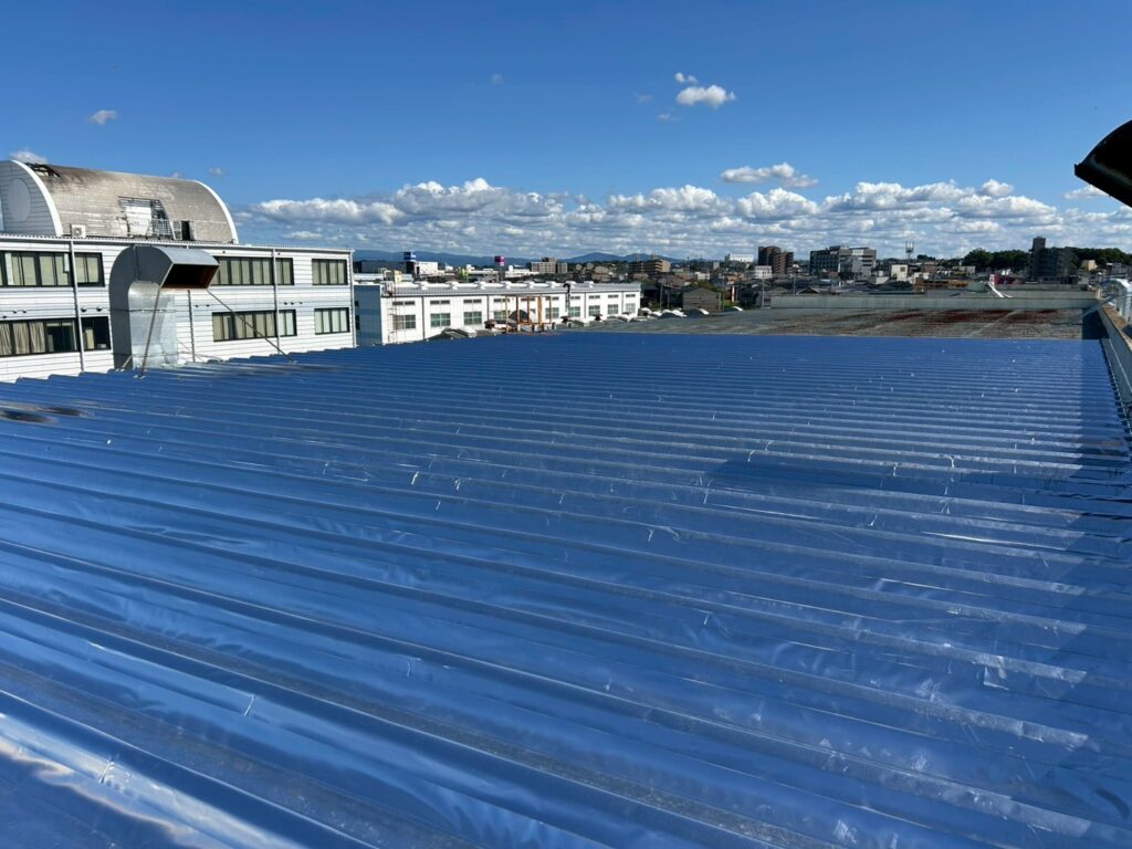 工場の折板屋根に施工する場合には、弊社で対応が可能な「スカイ工法」の導入がおすすめです。スカイ工法とは、輻射熱の反射性能に優れたスカイシートを屋根に直接貼り付ける施工方法のことであり、ジョイント部分もシートでしっかり覆うため、省エネ・輻射熱・雨漏り対策に効果を発揮します。