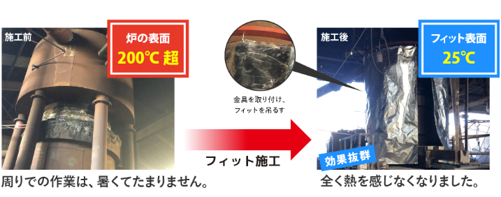 機械に遮熱シートを施工することで、そこから発生する輻射熱を抑え、室温の上昇を抑制し、結果として従業員の健康を守ることに役立ちます。