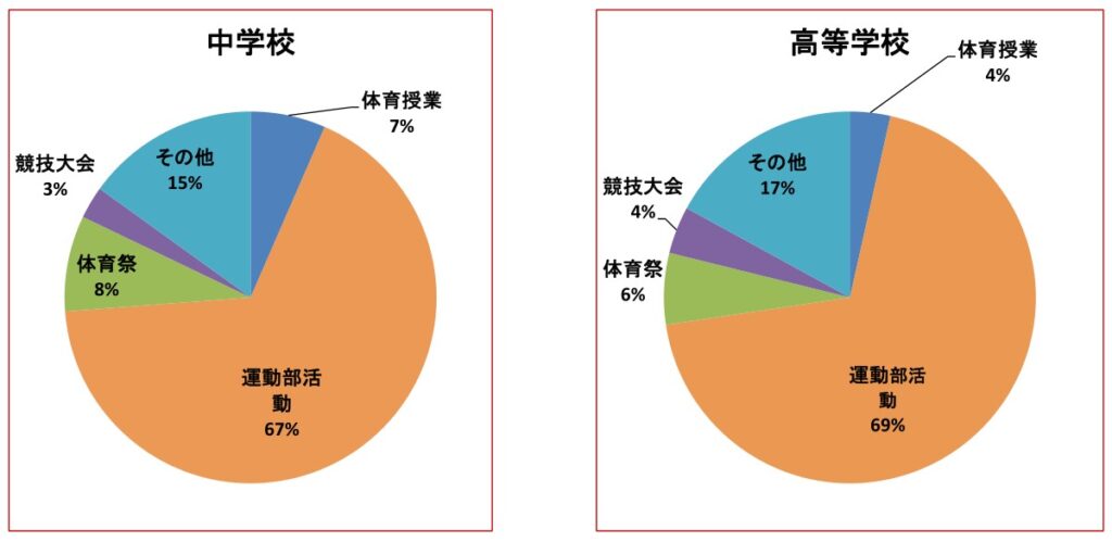 環境省の資料によると、学校管理下での熱中症発生は中学校・高等学校で9割を占めており、そのうち約7割が運動部活中の発症です。