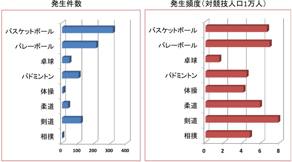 スポーツの種目別で分けると、バスケットボール・バレーボール・バドミントン・柔道・剣道が多いことが分かります。