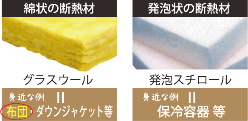 断熱材は空気を多く含んだ素材でできており空気の層で熱の伝わりを遅くしています。