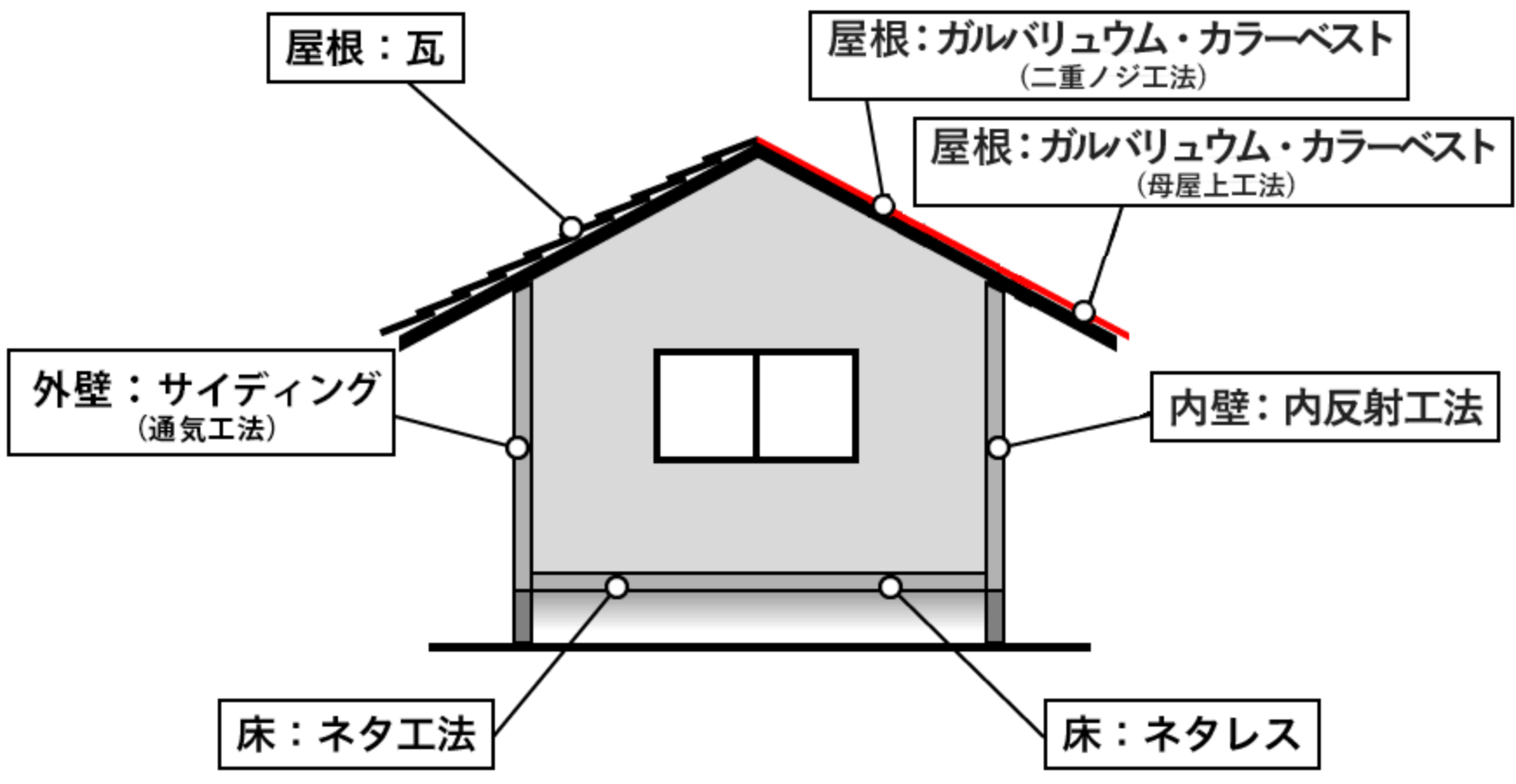 住宅の屋根、壁、床下にサーモバリアを使用することで夏の輻射熱の侵入を防ぎ、冬の室内から屋外へ逃げる輻射熱をとどめる効果が期待できます。