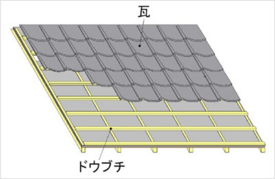 垂木のピッチに合わせて、垂木方向にドウブチ(10mm厚程度の木)を打ち、瓦用のサン木を打って、瓦を伏せます。