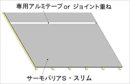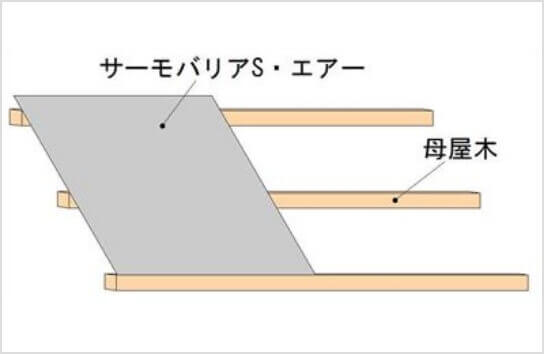 通常施工で垂木施工後、ノジ板を打ち、ノジ板の上にサーモバリアS(4mmタイプ)を敷きます。