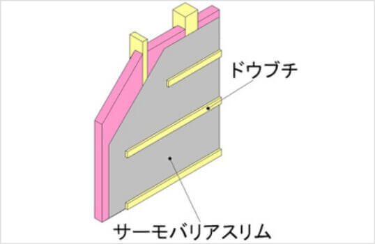 柱、間柱の間に断熱材を取付けます。サーモバリアスリムまたはエアーを柱、間柱の内側に取付けます。反射空気層を設けるためにサーモバリアの上にドウブチを取付け石膏ボードを取付けて完成です。