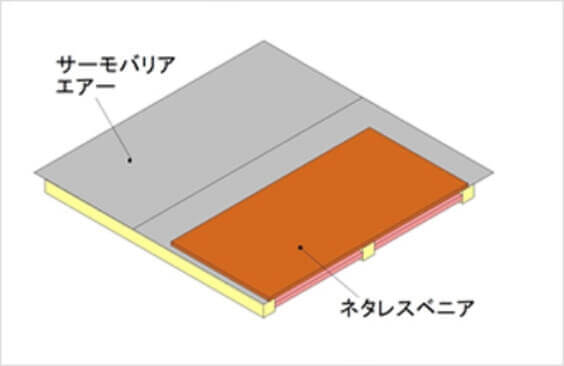 住宅の屋根、壁、床下にサーモバリアを使用することで夏の輻射熱の侵入を防ぎ、冬の室内から屋外へ逃げる輻射熱をとどめる効果が期待できます。